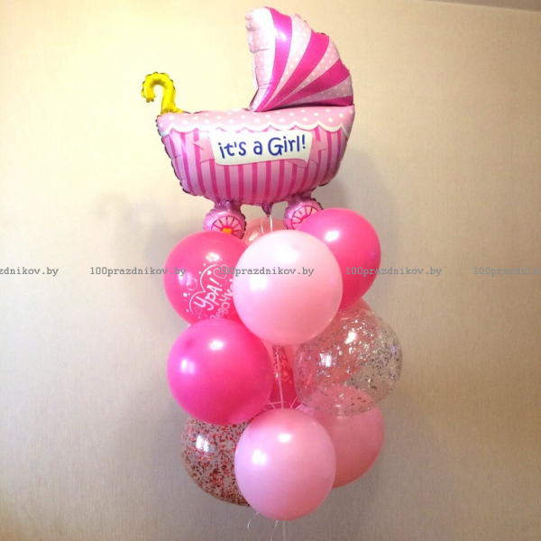 В букете: 13 латексных шариков размером 12"/30 см с рисунком, 1 фольгированный шар круг размером 18"/45 см, 1 большая коляска размером 40/102 см.