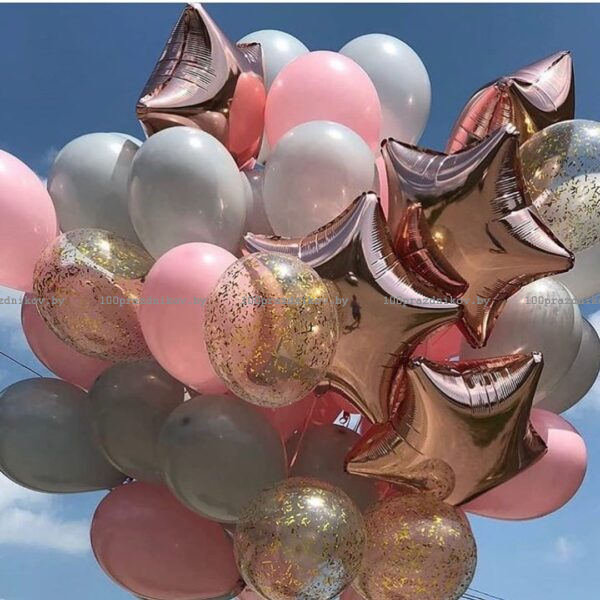 Состав сета:24 простых шара, 35 см6 шариков с конфетти, 35 см5 звезд, 46 см
