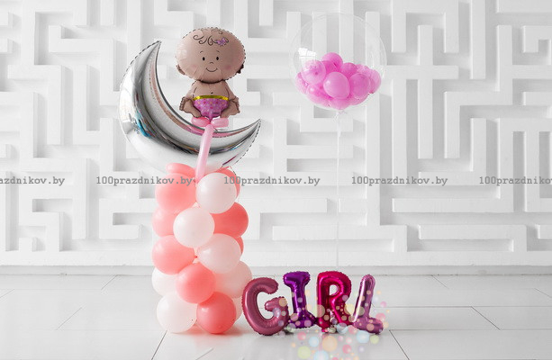 Колонна из белых и розовых шаров с серебряным месяцем и фольгированным шаром "Малышка-пупс" ( вся композиция, кроме малышки-пупса надувается воздухом)