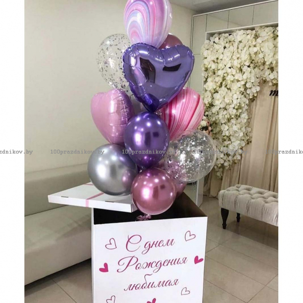 без коробки( в коробку такое кол-во шариков не вместится) белая коробка отделино без оформления стоит 35руб
