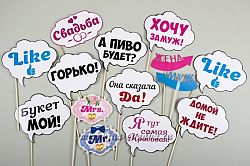 Эти недорогие аксессуары помогут сделать ваши фотоснимки по-настоящему веселыми и забавными. Обычно в такие наборы входят губки, галстуки, усы, очки на палочке, который стоит только приложить к лицу, а получается очень смешной образ. Эти милые фото заставят потом еще не раз улыбнуться за просмотром счастливых мгновений свадьбы.