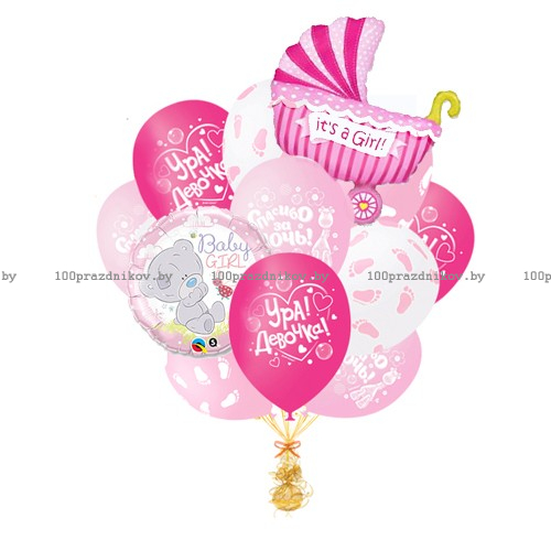 В букете: 13 латексных шариков размером 12"/30 см с рисунком, 1 фольгированный шар круг размером 18"/45 см, 1 большая коляска размером 40/102 см.