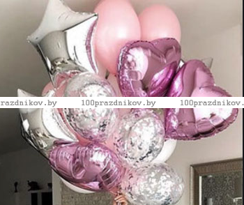 В сете шаров: 7 латексных шарика размером 12"/30 см , 3 фольгированный шар сердце размером 18"/45 см, 3 фольгированный шар звезда размером 18"/45 см, 3 латексных шарика размером 12"/30 см с конфетти.