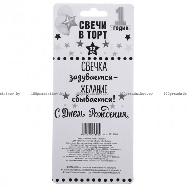 Cвечи тонкие в торт "1 годик" 12 шт.