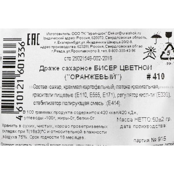 Драже сахарное Бисер цветной "оранжевый" 50 г