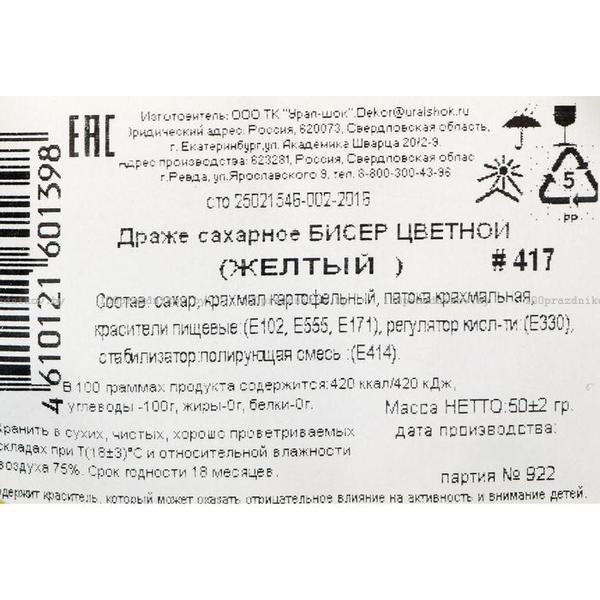 Драже сахарное Бисер цветной "желтый" 50 г