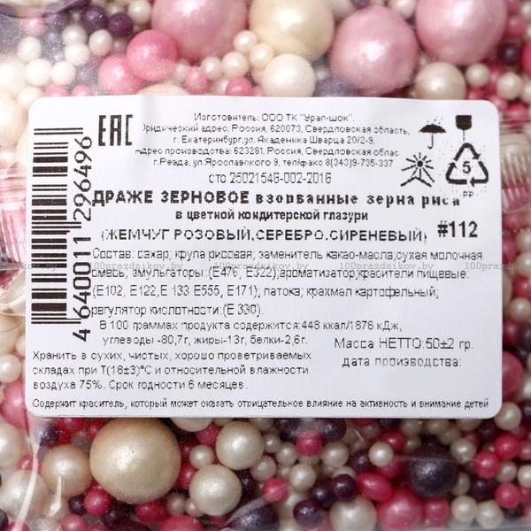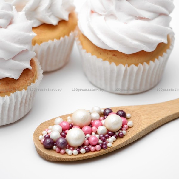 Драже «Жемчуг», взорванные зёрна риса в цветной кондитерской глазури, розовый/серебро/сиреневый, 50 г