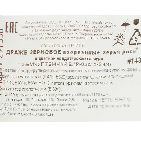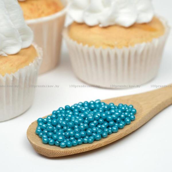 Драже «Жемчуг», взорванные зёрна риса в цветной кондитерской глазури, тёмная бирюза, диаметр 2-5 мм, 50 г