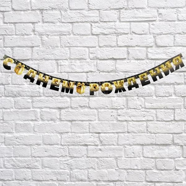 Гирлянда на люверсах «С Днем Рождения», чёрно-золотой с подарком, дл. 225 см