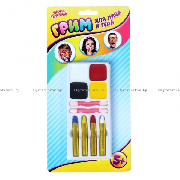 Грим для лица и тела, 4 цвета + 4 карандаша + 2 аппликатора