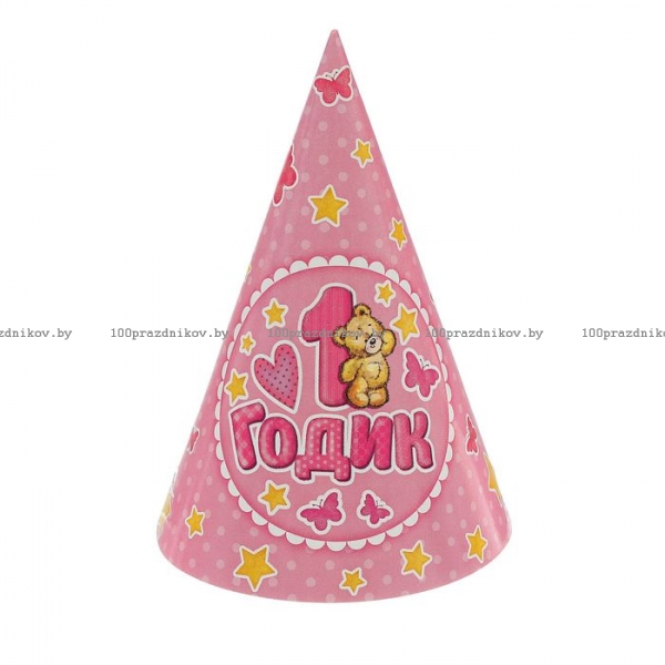 Бумажный колпак "1 годик Малышка, шарики и звезды",цвет розовый , 16см