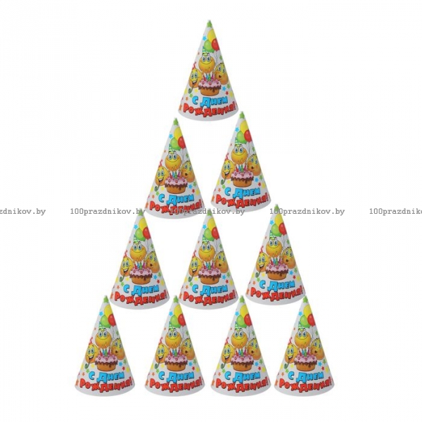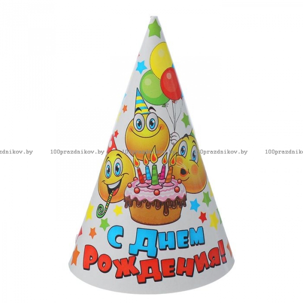 Колпак бумажный "С Днем Рождения" смайлы и звезды