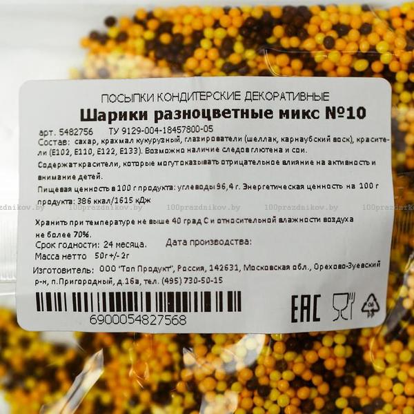 Кондитерская посыпка "Шарики", разноцветный микс № 10, 50 г