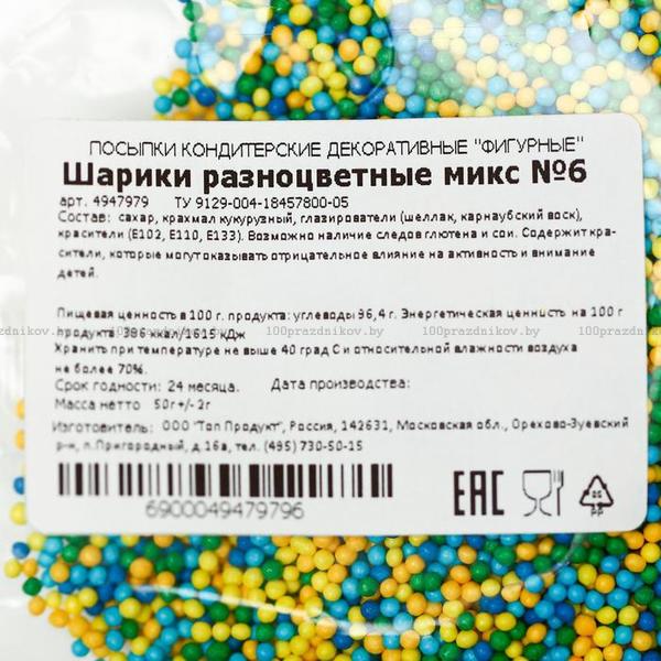 Кондитерская посыпка "Шарики", разноцветный микс №6, 50 г