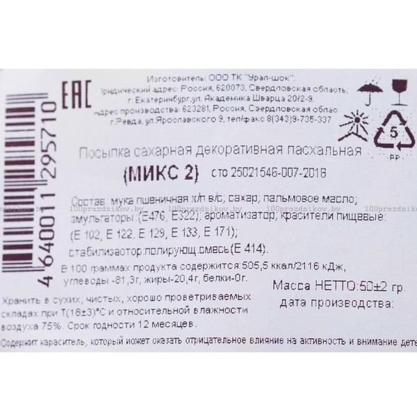 | Состав | мука пшеничная х/п в/с, сахар, пальмовое масло, эмульгаторы (Е476, Е322), ароматизатор, красители пищевые (Е102, Е122, Е129, Е133, Е171), стабилизатор: полирующая смесь (Е414). |