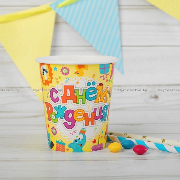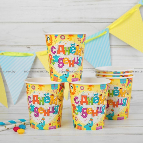 Набор бумажных стаканов "С Днём Рождения", зверушки, 250 мл, 6 шт.