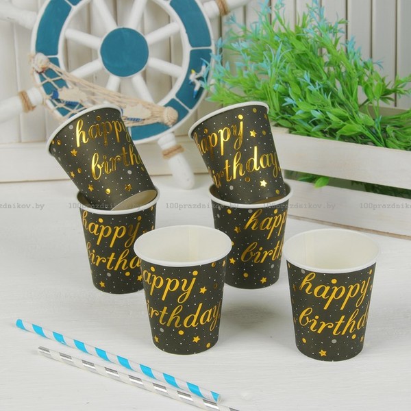 Стакан бумажный «С днём рождения», 225 мл, набор 6 шт., цвет чёрный
