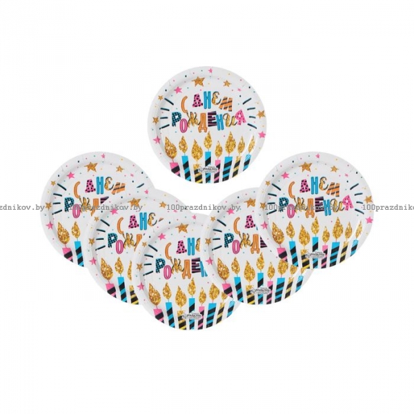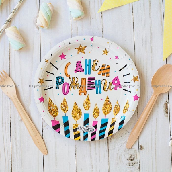 Тарелка бумажная "С Днём Рождения", свечи и звёзды, 18 см